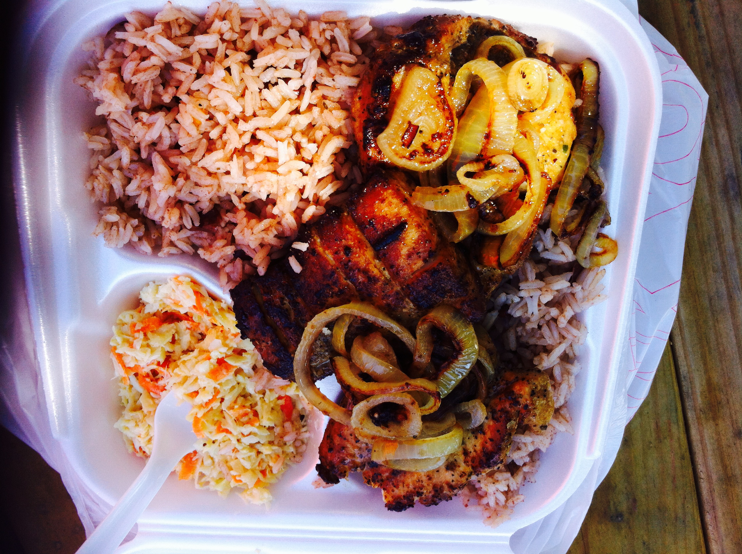 I ordered some Jerk Mahi Mahi, a locally sourced fish, with the traditional fried onions, beans, rice and coleslaw. My meal took around 15 minutes to arrive, during which time I was being kept entertained by a local lady who after initially asking to use my Factor 40, then continued to tell me all about the highs and lows of life on the island.