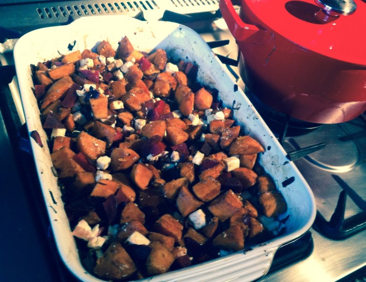 -Place the sweet potatoes in the oven-proof dish with the onions & garlic and mix up well.