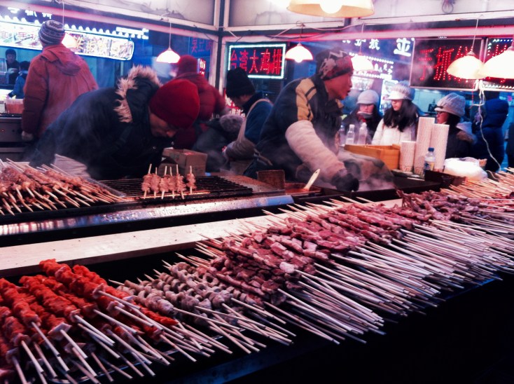 The food here was very different from that in other areas of China I had visited, but it was just as tasty, with less spice being replaced by more richness with many potato and sausages based recipes. From a street vender I tried a pancake which consisted of spring onion, sausage and egg. Well-seasoned I went back for more, before being drawn towards the next vender selling various meats and seafood on kebab sticks. These too were delicious. I tried the chicken and pork kebabs which were lightly spiced with cumin and turmeric.