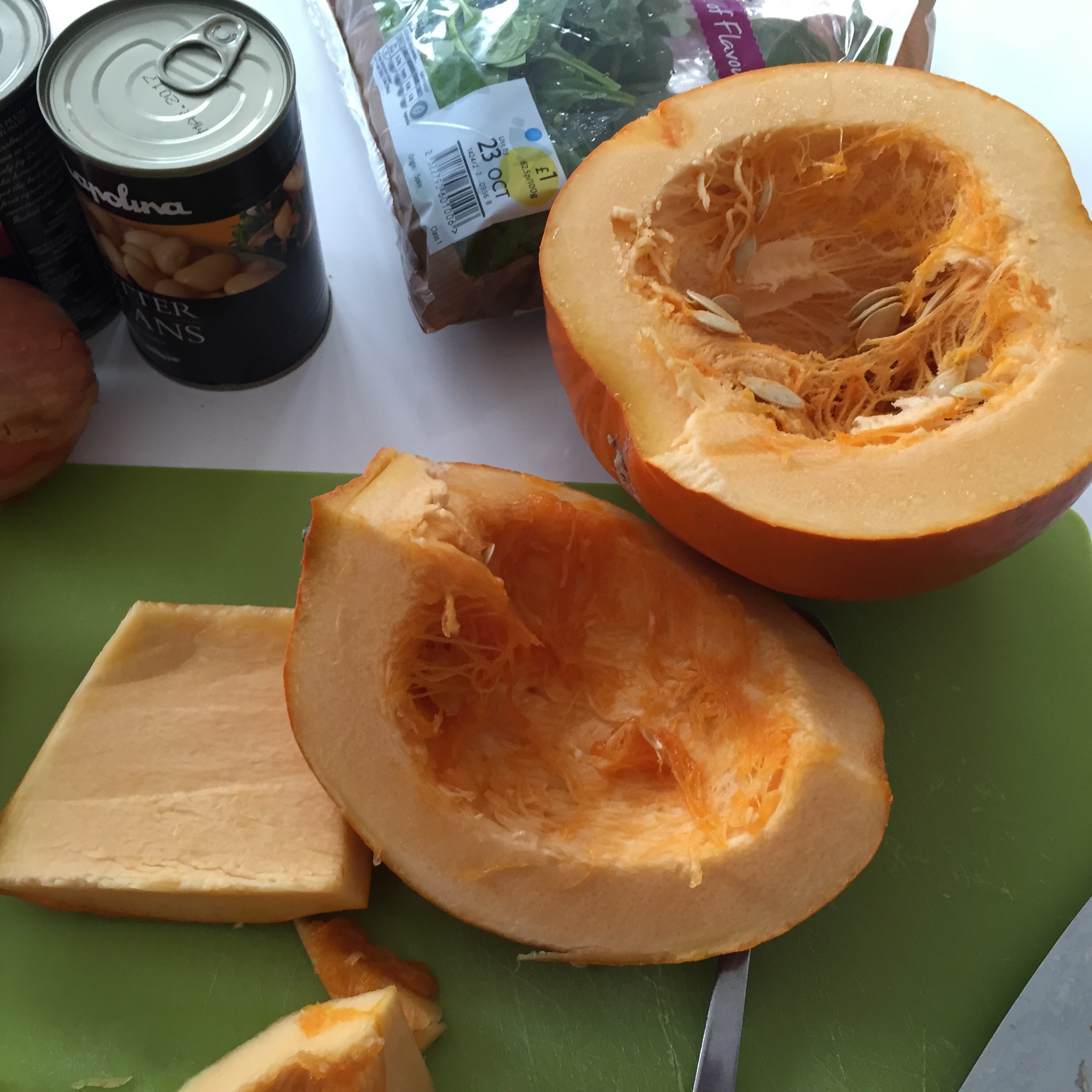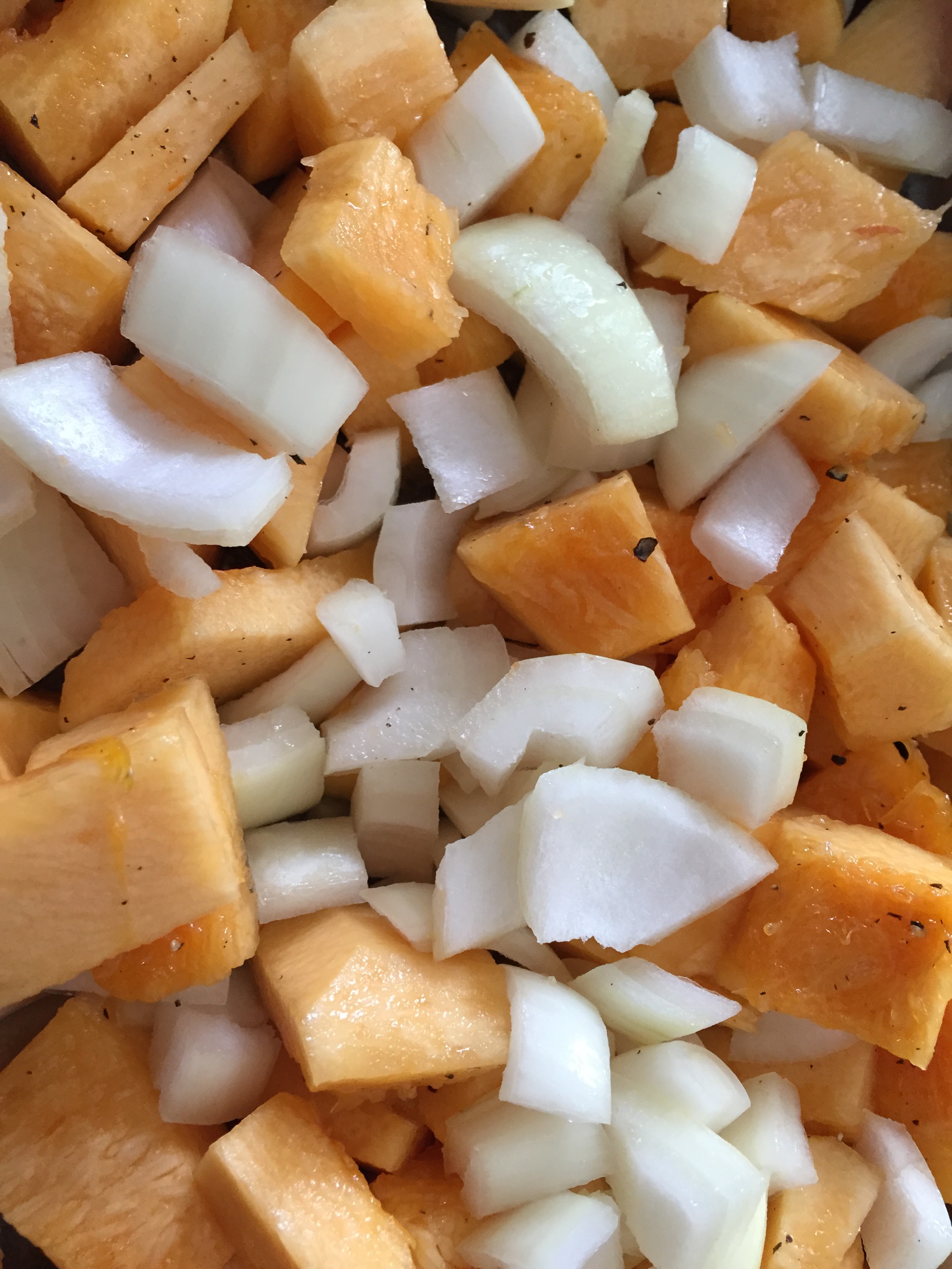 – Put the pumpkin & onions into a roasting tin with 3 tbsp. olive oil, salt & pepper. Mix well and put in the oven for 30 minutes or until the pumpkin has soften.