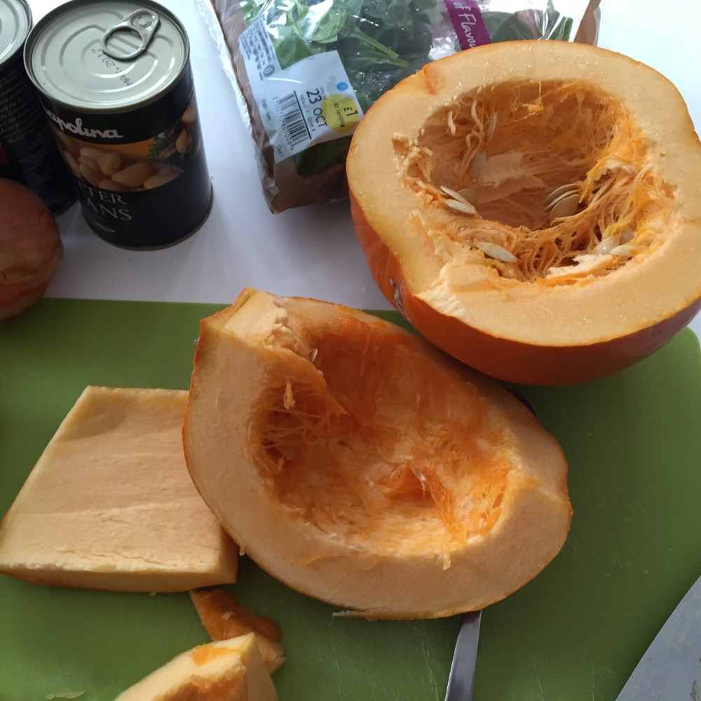I’m not going to lie to you, preparing a pumpkin is messy & hard work, but once you’ve remove the flesh from the skin and scraped out all the seeds, you do feel a sense of accomplishment. Make sure you have a big, sharp knife and ensure you carve carefully to avoid losing a finger or two!