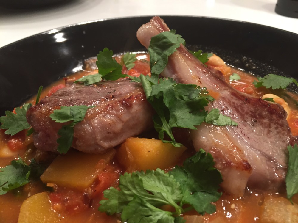-Whilst the lamb cutlets are cooking, remove the bay leaves and cinnamon stock from the stew and serve up. Place 2 of the cutlets onto the top on each plate/bowl, sprinkle some coriander over the top and enjoy!