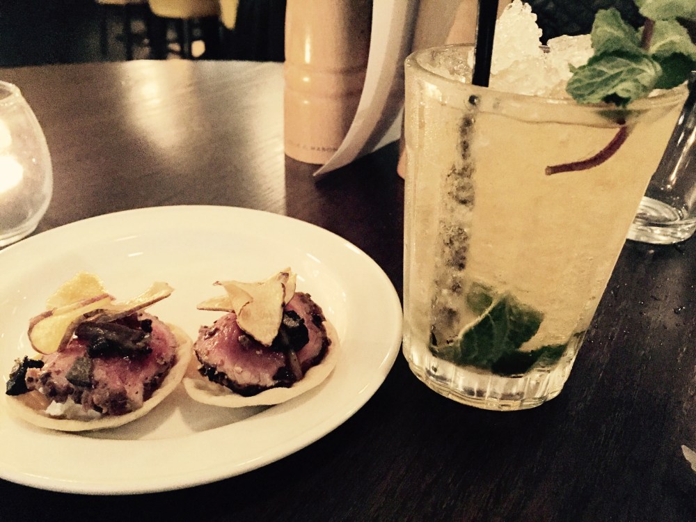 The first drink certainly felt like the strongest! It was simply Cognac & Mint with a little sugar syrup & ice (Cognac Julep). This was served along with a Zebra & Truffle Tart: an artichoke crisp canapé topped with thinly sliced Zebra, Truffle & Parsnips, which had a subtle hint of garlic. A delicious appetiser.