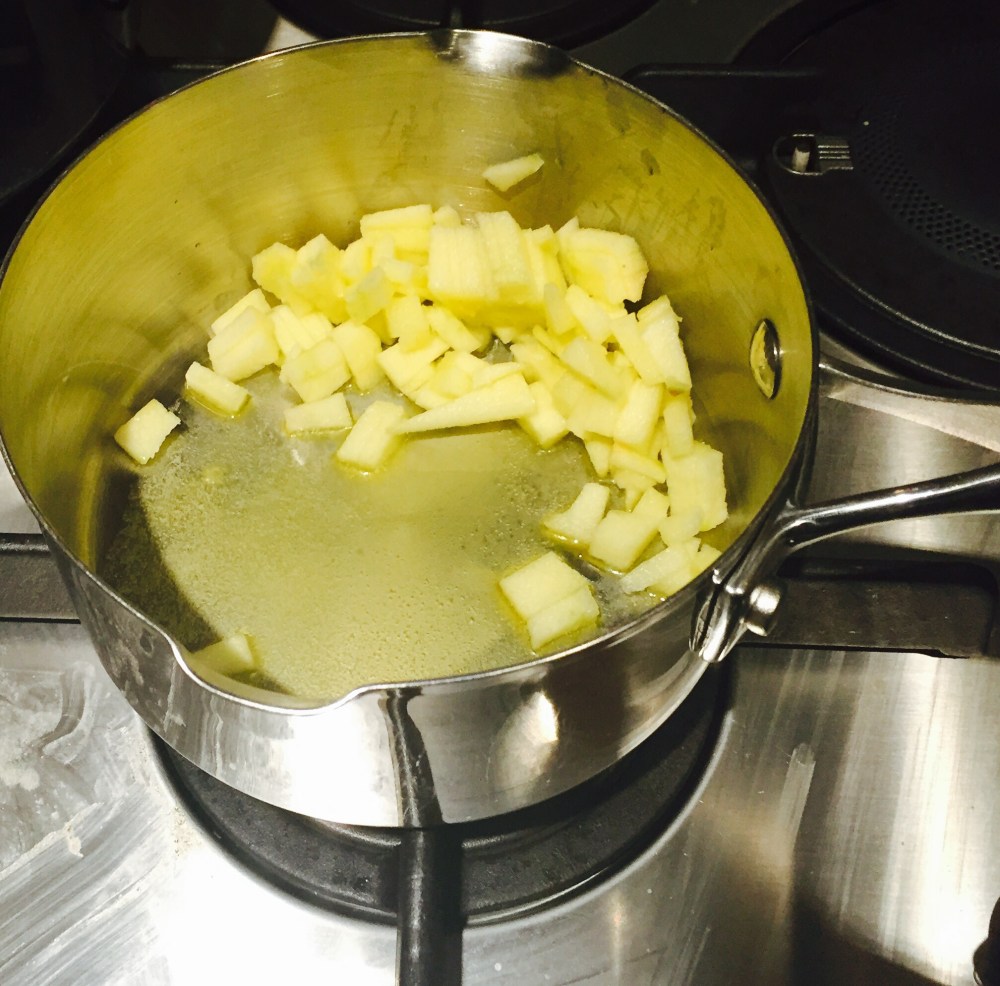 – Add the apple, cinnamon & syrup. Cook for approx 15 mins until the apple has soften.