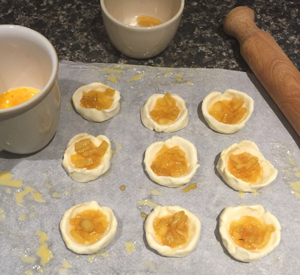 – Whilst the apple is cooking, roll out the pastry into small round discs. I made 9 out of my left over pastry. Use the end of the rolling pin to mound the discs around. Brush the egg over the top of the discs.