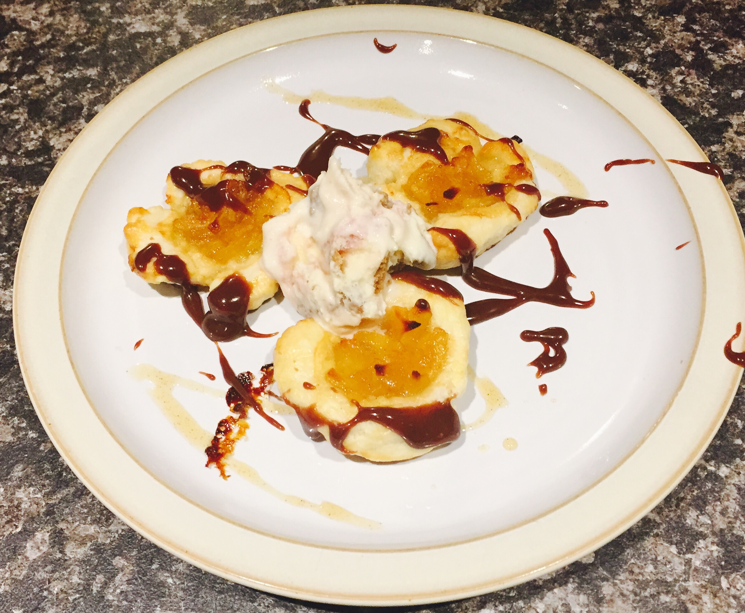 To finnish the dish off it needed something else, there’s always chocolate in the house, so I grabbed some chocolate buttons. The one place I hadn’t looked in was the freezer, as I opened it there was some ice cream jumping out at me, perfect!