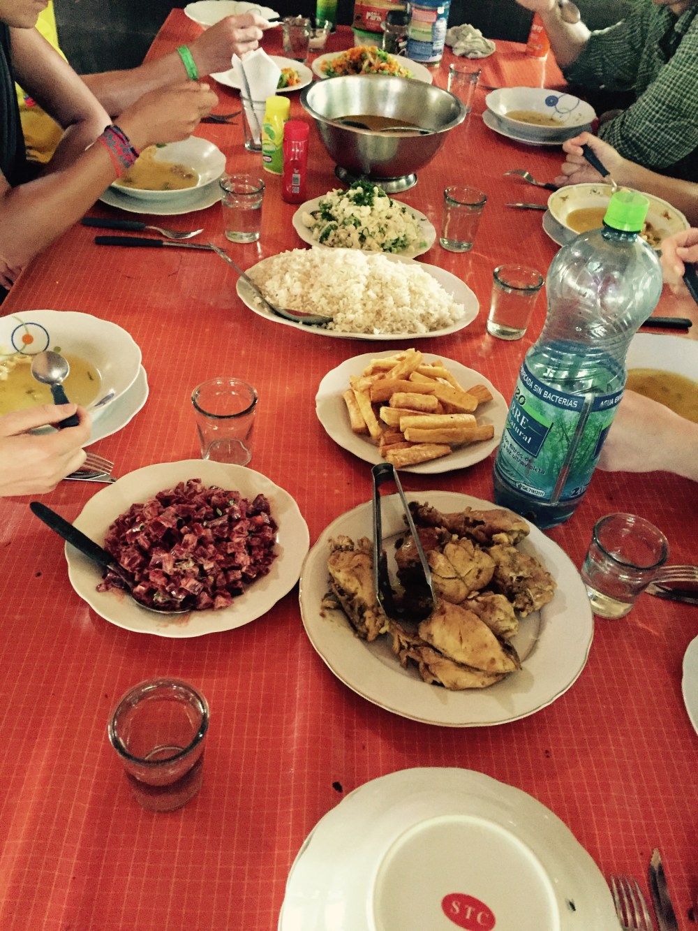 Lunch is the largest meal of the day in Bolivia, and often starts with soup which we had on both days, then followed by chicken or beef, rice, coleslaw and vegetables. It was all reasonably healthy, apart from the additional salt that was put on certain foods like cucumber and grapefruit! No spices were used in the cooking, but the food was still tasty and was cooked really well.
