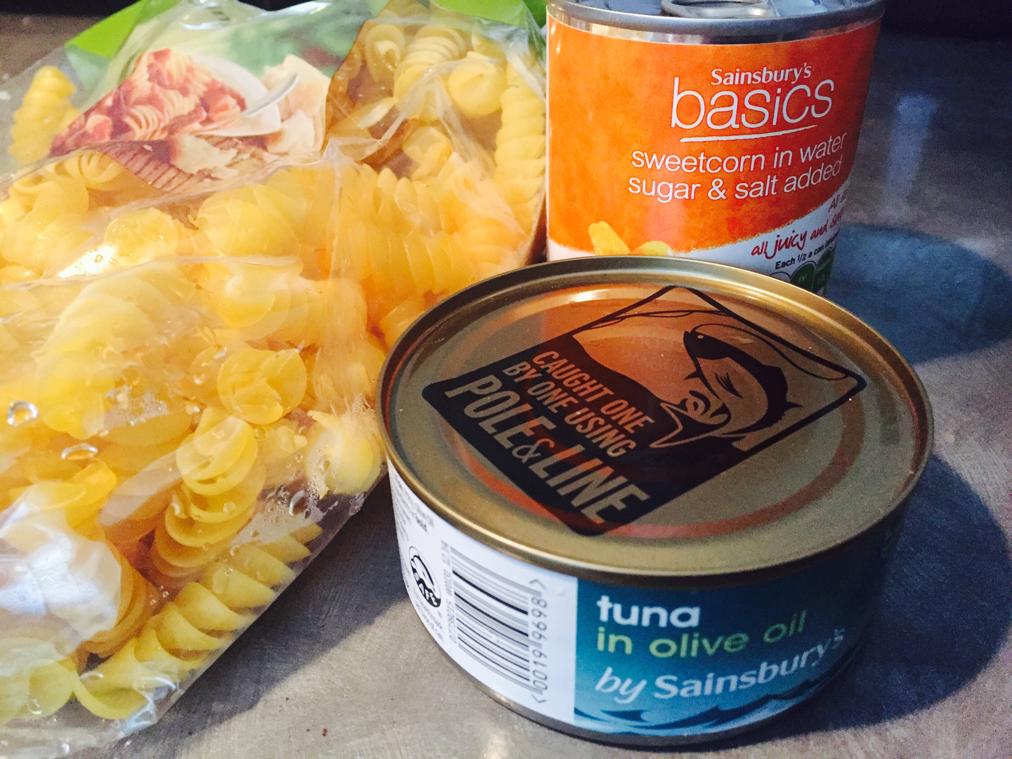 Tuna Pasta Bake – Add the cheese sauce to a cooked pasta of your choice. To the pasta add 2 tins of tuna (always with sunflower oil for me), a good cup size of sweet corn, and cooked broccoli for a quick gooey bake. Don’t forget to brown the top!