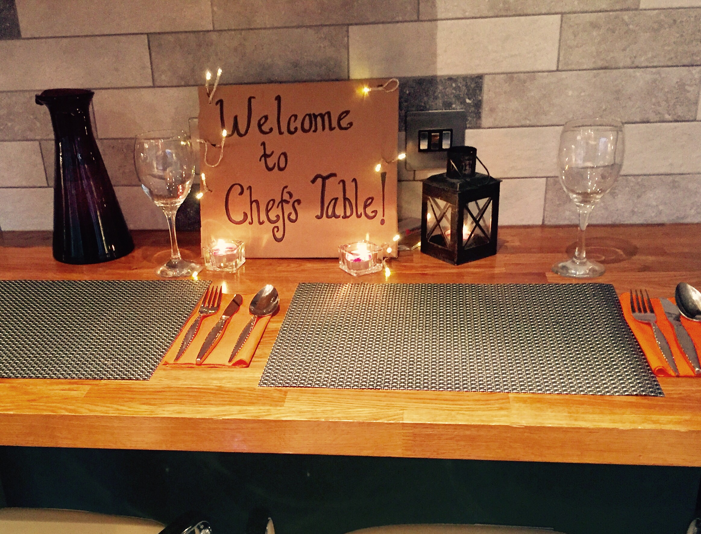 We made use of the outside patio area by putting up a gazebo to be used as an extra seating area. It felt like I had my own pop up restaurant! The end of the breakfast bar was turned into the ‘Chefs Table’, where two guests would sit and chat to me and my sous chef Mark, as we cooked and plated up the good. This was rotated after each course so guests moved around and interacted frequently with each other.
