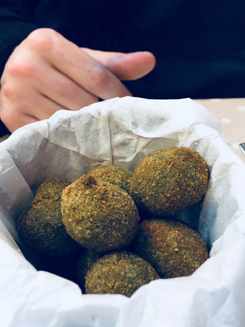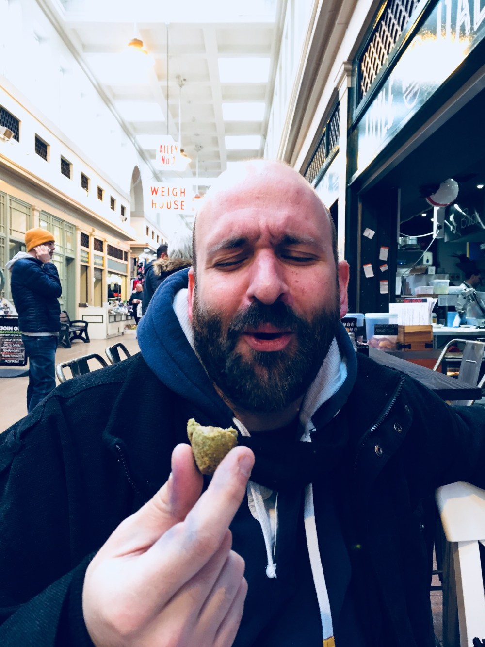 Thomas enjoyed some deep fried Olives from Abrootso & Cultures, an Italian cafe. See the below photo showing just how much he enjoyed them! I opted for a local dish of a Hot Saveloy dip with Pease Pudding and Stuffing on a Stottie muffin, from the Delicatessen stall.