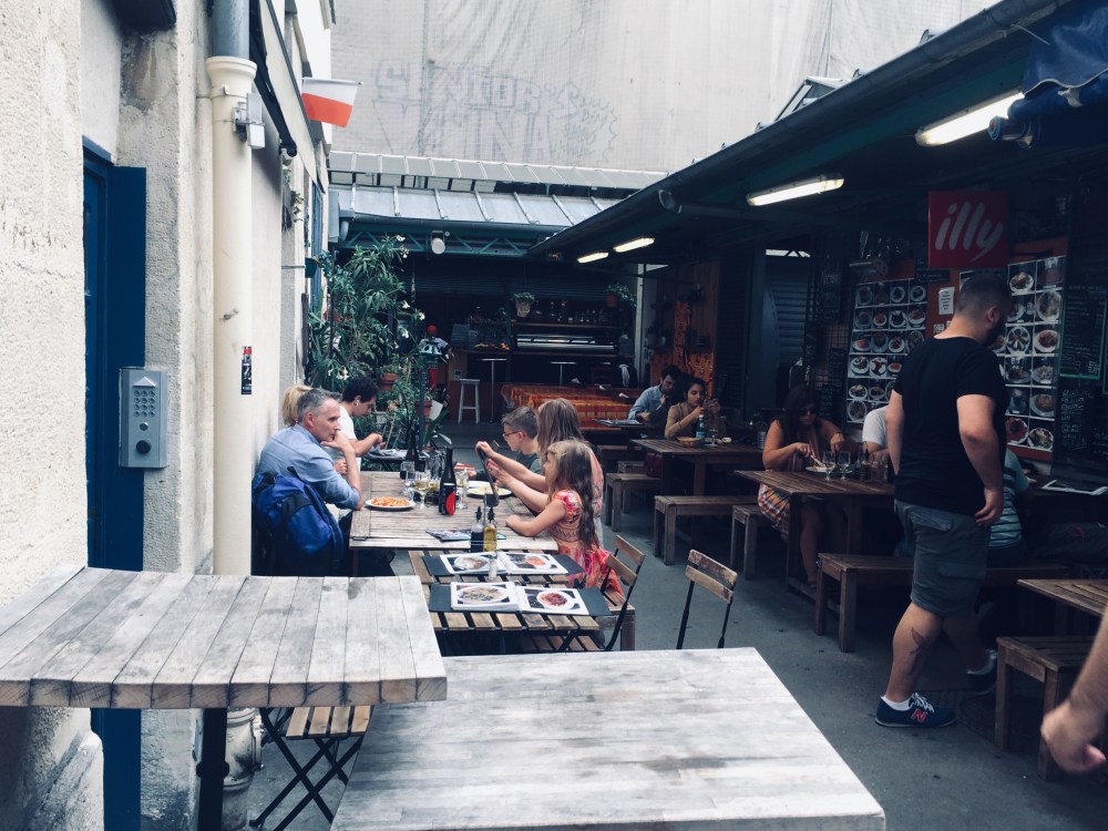 After stopping for an obligatory coffee, we walked about ten minutes to the La Marais area. My friend Kathleen used to live not far from Paris and it was an area she recommended visiting. it was a nice area lined with bars, patisseries, shops and restaurants. We stopped for our first macarons of the trip, one of my favorite desserts, grabbing a box as we continuing walking. A few blocks later we came across le Marche des Enfants Rouge (Market of the Red Children). It’s the oldest covered market in Paris. Its curious name refers to the nearby Hospice des Enfant-Rouges where orphans wore red clothing. As were not hungry enough yet for food we enjoyed wandering around wishing that we were! We were however ready for a glass of vin rouge, so stopped at a cafe bar across the way.